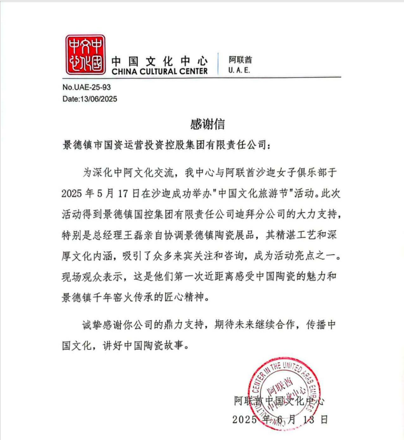 這份來自阿聯(lián)酋官方的誠摯感謝,不僅是對(duì)集團(tuán)迪拜分公司團(tuán)隊(duì)高效執(zhí)行和專業(yè)能力的肯定,更是對(duì)景德鎮(zhèn)陶瓷文化國際影響力的有力印證,彰顯了我們?cè)谕苿?dòng)中國文化“走出去”、促進(jìn)國際文化交流合作方面的積極作為。